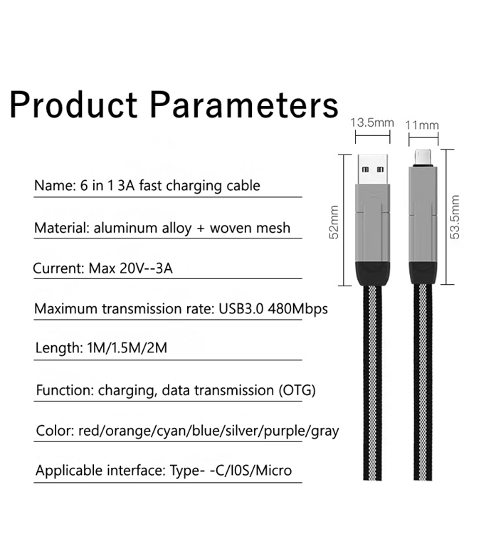 Our versatile and convenient 6-in-1 Braided Charging Cable – the perfect solution for charging and data transfer for most smart phones and digital devices. With its colorful and well-designed appearance, this cable is a great choice for those looking for a stylish and functional charging solution.