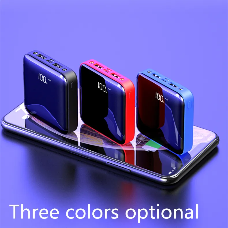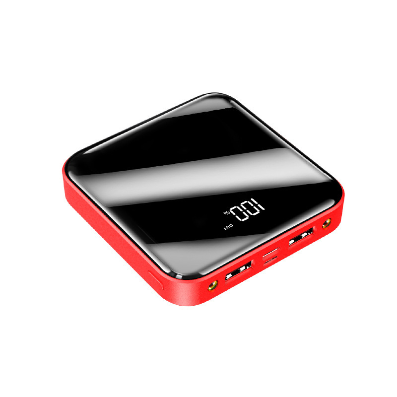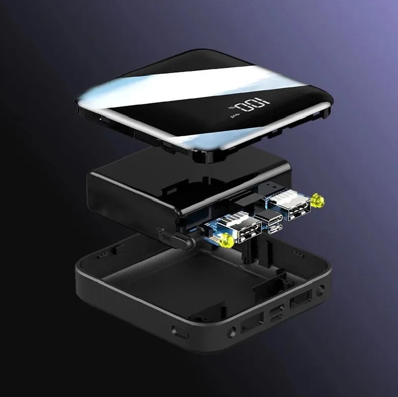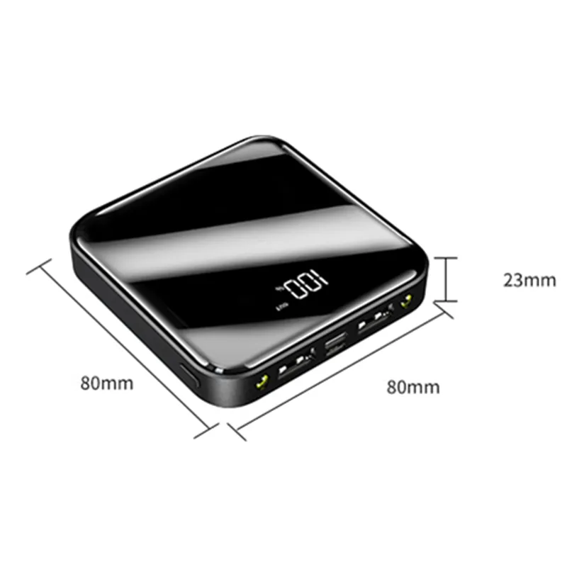 The Square Power Bank With LED Display. It’s a compact and portable charger with a 10000mAh capacity. It offers fast charging at 2.1A and features a convenient LED display to monitor battery power. With its mirror/high face value design, it doubles as a stylish mirror. Perfect for travel and on-the-go charging.